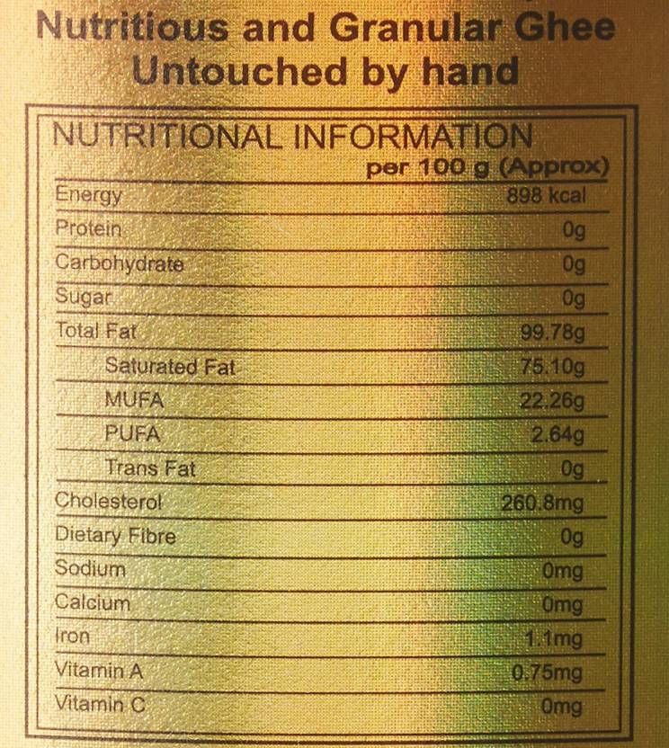 - Patanjali Cow ghee contains only those fatty acids or saturated fat that are primarily 89 % short chain fatty acids, compared with the longer chain with other animal fats. it is the long chain fatty acid that is associated with blood clotting and thrombosis